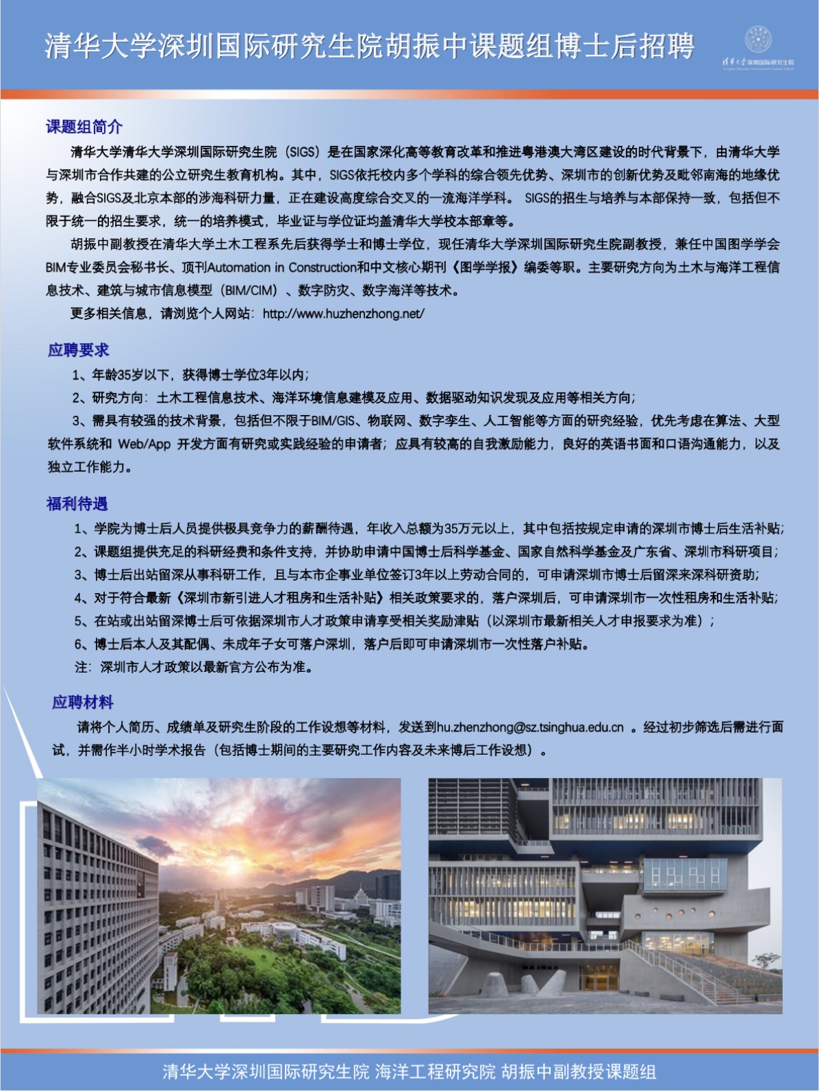 关于博士后招聘还应满足以下两点:1)年龄35岁以下,获得博士学位3年以内;2)研究方向为土木工程信息技术、海洋环境信息建模及应用、数据驱动知识发现及应用等相关方向。(注:博士后申请者经过初步筛选后需进行面试,并作半小时学术报告,包括博士期间的主要研究工作内容及未来博后工作设想。)